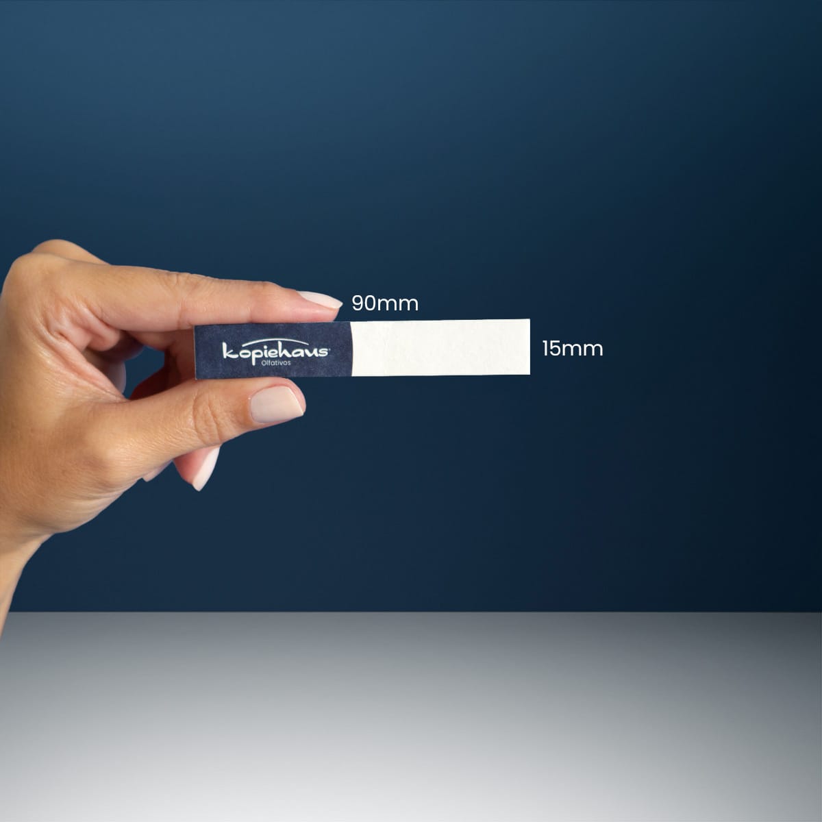 Caixa com 200 cartões embalados em 02 sacos PE com 100 unidades cada. Modelos RETOS na medida 15x90mm, em dois modelos de impressão (fundo azul com Logo Kopiehaus “vazado”, ou logo Kopiehaus impresso em azul).